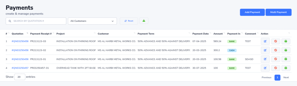 • Complete Payment Dashboard Overview – Monitor all payments with detailed tracking of quotations, receipts, projects, and payment terms in one centralized location