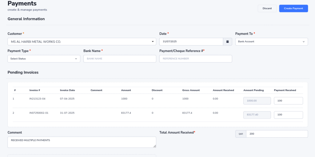 • Advanced Payment Recording System – Record payments with comprehensive details including bank information, cheque references, payment types, and custom comments